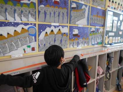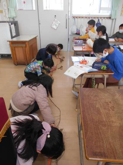 1mの長さがどれぐらいか量感をもとに、今日は1mより長い長さを測りました。はじめにみんなで教室の横の長さを測り、測る方法を確認しました。その後、班で協力しながら、黒板の横の長さやロッカーの長さ、教室のドアの高さなどを測りました。秋に収穫したサツマイモの茎の長さは、5m15cmもありました。