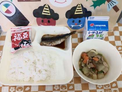 給食では、節分の行事献立として「いわしのしょうがじょうゆかけ」と「いり大豆」が登場しました。