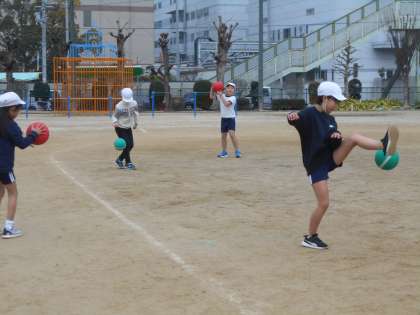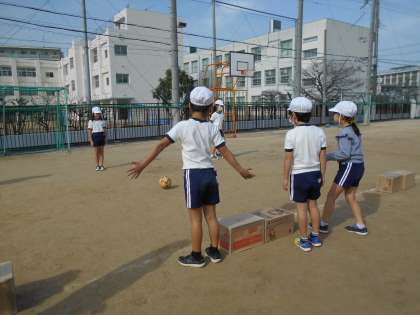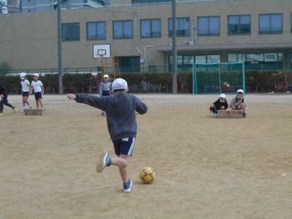体育の時間に、音楽で学習した「あんたがたどこさ」をしました。ボールをつきながら「あんたがたどこさ ひごさ ひごどこさ くまもとさ…」と歌い、「さ」の部分で、足をぐるっと回してボールをまたぎます。「ボールをつく」「歌う」「足を回す」と、3つのことを同時にしなければならないのが難しかったようですが、楽しく取り組んでいました。その後、グループに分かれて的をに向かってボールを蹴るゲームをしました。前回よりも距離を延ばしましたが、蹴りたい場所に向かって正確に蹴ることができる人が増えたように感じました。「さっきより勢いがある!」「真ん中に当たった!」など、ひとり一人がレベルアップを目指して取り組んでいました。