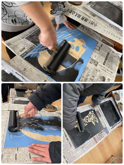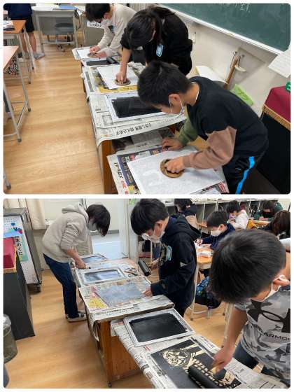 今日は、彫刻刀で頑張って彫った板にインクをつけて刷りました!5年生なので、最初に手順を説明するととてもスムーズに行うことができました。