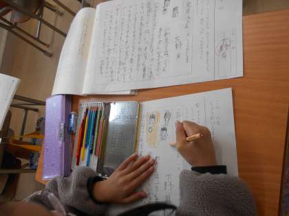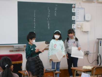 今日は、「この人をしょうかいします」の発表の日でした。自分が周りの人に紹介したい人を決め、その人について詳しく説明する学習です。これまでの時間に、「自分が聞き手に何を伝えたいか」「書く順番」「様子がよく伝わるようにするにはどうすればいいか」などを考えてきました。推敲をして出来上がった作文を、友達の前で読みました。家族を紹介する人、習い事の先生を紹介する人、色々でした。思わぬ人から「友達の〇〇さんを紹介します。」と自分を紹介された人もいて、照れくさいけれど嬉しそうにしている人もいました。