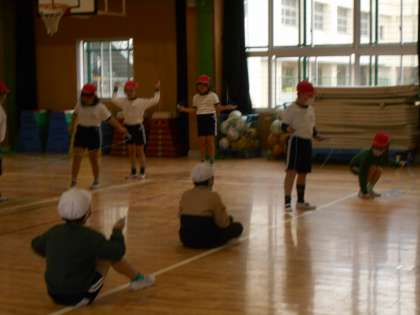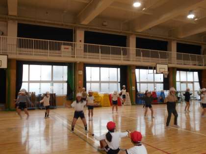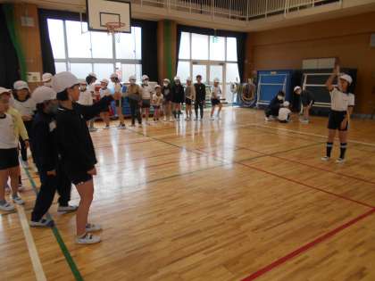 金曜日に続いての雨で運動場に出られず、2回連続で体育館での体育になりました。準備体操をした後は、表現運動をしました。「飛行機」「バイク」「ぞう」「だんごむし」「恐竜」など、出されたお題を体を使って表現しました。「飛行機」と「バイク」ではスピード感を出そうと、ポーズをとったり口で効果音を出しながら走る人たちがいました。「ぞう」では、肩から腕全体を使って、象の特徴である長い鼻を表現する人が多かったです。「だんごむし」になると、みんな丸まって一気に動きが少なくなりました。よく知っている生き物ですが、体を使って表現するのは新鮮だったようです。続いて、なわとびをしました。かけあしとびやグーパーとびなどの一人技を練習した後は、3人組になって「大波小波」をしました。とぶ方ももちろんですが、回す方もこつがいります。とぶ人がとびやすいように、膝を使ったり掛け声をかけたりしながら回すことができる人が増えました。楽しみながら、いろんな技に挑戦してほしいです。