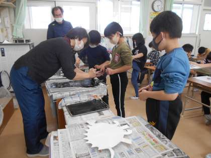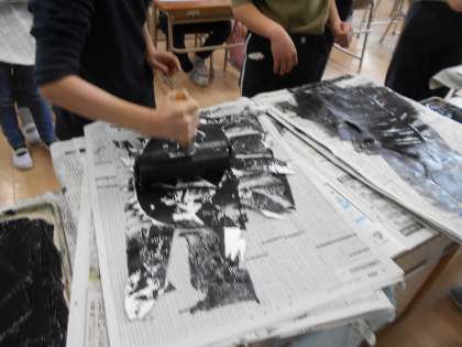 昨日出来上がった恐竜の版にインクをつけ、刷りました。スペシャルゲストに三好先生を迎え、インクののばし方・つけ方・紙の置き方・バレンや指を使ってのインクの馴染ませ方などを教えてもらいました。その後、2人ずつ前に出てきて、自分の版にインクをつけ、紙に刷っていきました。紙をはがすときには、みんな緊張した様子で、きれいに写った版を見ると「おぉ〜」と歓声が上がっていました。世界に1頭だけの、すてきな恐竜が完成しました。次の図工の時間には、絵の具を使って背景を描きます。