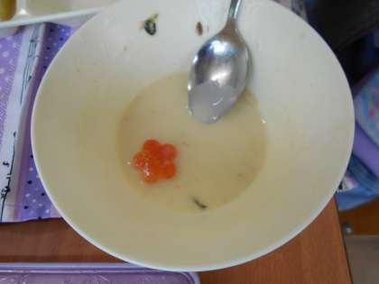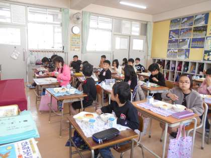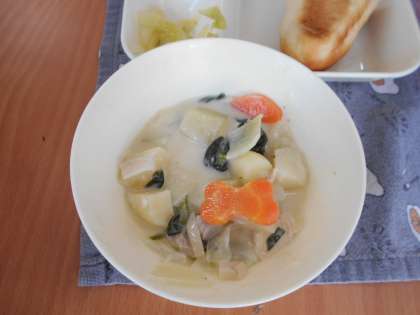今日のクリームシチューにはラッキーニンジンが6種類も入っていると知り、みんな自分のところに入っているかどうか楽しみにしていました。結果は、花の形が1人、リボンの形が1人でした。ラッキーニンジンは入っていなくても、「僕のには三角形のが入ってる。」「私のには丸の半分のが入っている。」などと、見つけながら食べていました。今日も時間内に全員完食しました。