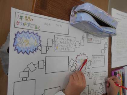 生活科では『大きくなった自分をふりかえろう』の学習で、「1年間の成長すごろく」を作っています。4月に比べて、学習面・生活面共に大きく成長した2年生。その記録を、すごろくに記録していきます。「ミニトマトが赤くなった。甘くておいしかった。1マス進む。」「九九マスターになった。2マス進む。」「ミッキーマウスマーチの演奏で間違えた。1マスもどる。」など、それぞれのユーモアのあるマスがおもしろいです。出来上がりが楽しみです。