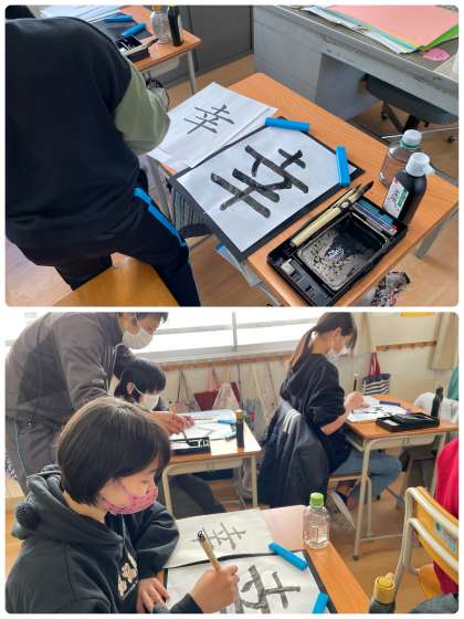 24日金曜日の学習参観では、講堂で行う音楽発表の後、教室では5年生を振り返って考えた漢字一字をプレゼンします。その漢字を毛筆で書きました。