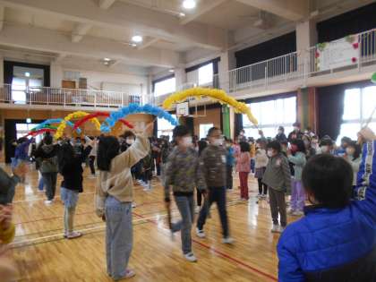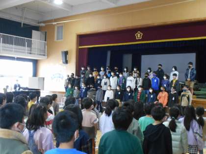 今日は卒業を祝う会、心をひとつに練習してきた呼びかけと歌を6年生の前で披露しました。『夕やけこやけ』の前に「ぜひいっしょに歌ってください。」と呼びかけると、なんと、6年生は全員立ち上がり、一緒に歌ってくれました。2年生は「びっくりしたけど嬉しかった!」「歌ってくれてよかった!」「やっぱり6年生の歌声はめっちゃきれいやった!」などと言っていました。『またあえる日まで』も、心をこめて歌いました。2年生からのお祝いの気持ちは、きっと6年生に届いたことと思います。最後の6年生の合奏と合唱はとても上手で、さすがでした。合奏ではタヌキ(の着ぐるみを来た6年生)が2匹登場し、大盛り上がりでした。教室に帰ってからもタヌキの動きを真似している人たちがいました。帰りの会で「6年生の上手な合奏と歌を聞けてよかったです。」と発表する人もいました。6年生の卒業まで、あと10日。2年生にとっても、素敵な思い出が増えました。