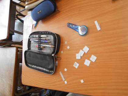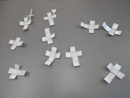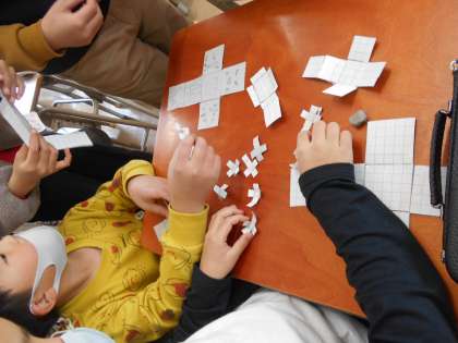 算数科で「はこの形」の学習をした後、1組では余った工作用紙を使って作品を作る遊びが流行っています。面が6つ必要で、どう繋げるとはこの形になるかを理解していないとできない遊びです。さいころ、人間、入れ物、中にはトイレ(便器と蓋)を作っている人もいました。みんな想像力豊かで、「〇〇さんの城に行く。」「闘って負けた〜。」などと言いながら、とても楽しそうに遊んでいます。高学年になって展開図の学習をするときに役立ちそうです。