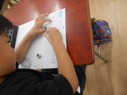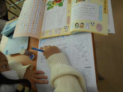 漢字の復習をした後は、書写シートを使い、横書きをする練習をしました。段落のはじめはひとます空けるなどの書き方は同じですが、漢数字ではなく算用数字を使うのは違うところでした。手本をはみ出さないようになぞったり、同じぐらいの文字の大きさで書いたりと、教科書をよく見ながら、それぞれが集中して取り組んでいました。横書きはよく使うので、日常生活に活かしてほしいです。