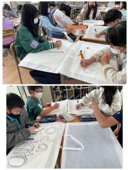 最後の作品は、作品を入れて持って帰るための作品袋です。片面には名前をデザインしています。裏には自由にイラストをかいていく予定です。