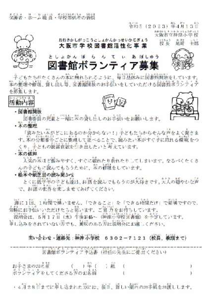 本の整理や修理、貸し出し等、図書館開放のお手伝いをしていただけるボランティアの方を募集しています。