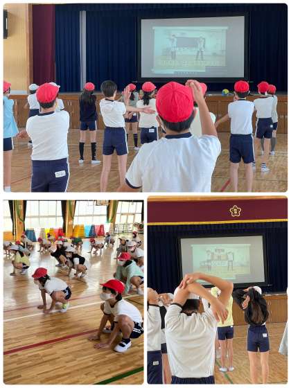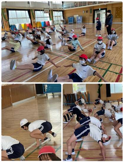 今日は初めての体育の学習でした。講堂で背の順の並び方を練習してから、神津体操をしました。久しぶりでしたが、映像を見ながら一生懸命動いていました。V字バランスやブリッジなども頑張りました!