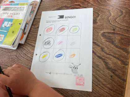 まずはじめに、今年度から神津小学校に来られたC-NETのルー先生に自己紹介をして頂きました。その後、ビンゴゲームを行いながら、ルー先生の出身国である『フィンランド』の食べ物や観光地などのことを教えて頂きました。みんなでリズムに乗りながら、「What’s color do you like?」と元気に言うことができました。