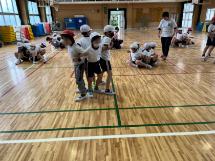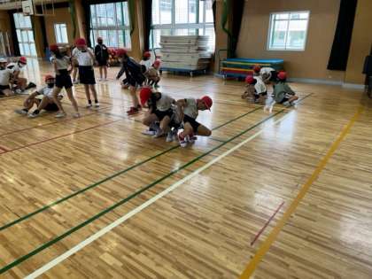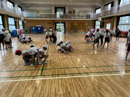 体ほぐし運動の学習をしています。スタンドアップという運動をしました。2人1組になり、背を向け合い腕を組んで立ち上がるというものです。担任が説明をした後に、「見本をしてくれる人?」と聞くと、何人かが挑戦してくれましたが、なかなか立ち上がることができないペアが続きました。しかし、成功したペアにコツを聞くと、ほとんどのペアができるようになったので、次は4人1組で挑戦しました。みんなと協力しながら4人でも、立ち上がることができました。