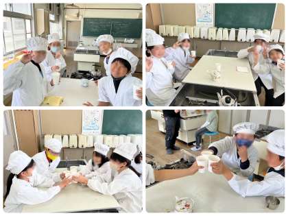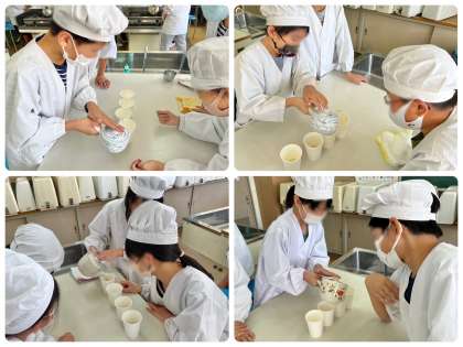 1回目の実習では、ガスの火をつけてお湯を沸かし、緑茶をいれました。そして、自分たちが入れたお茶を、「おいしい」「ちょっと苦いな」などと話しながら試飲しました。