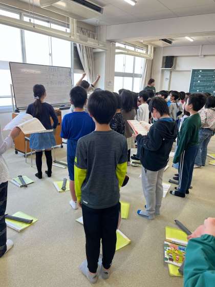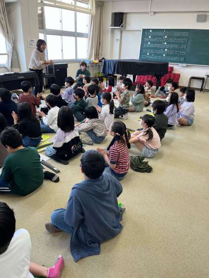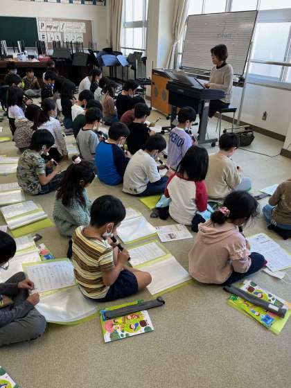 今までは、学級で音楽をしていましたが、初めて学年で音楽の学習をしました。人数が倍になったので、リコーダーの音色や合唱の声が普段と比べてより美しく、力強く音楽室に響き渡っていました。リコーダーは、初めて「月夜」という曲を演奏しました。宿題や授業で一生懸命練習していきましょう。リズム打ちでは、いろいろなリズムが出てきましたが、しっかりと聞いて正しくリズムを取ることができていました。合唱は、学級で練習していた「花束をあなたに」「さくらさくら」「いいことありそう」を歌いました。