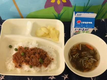 給食では、牛ひき肉、豚ひき肉、たまねきなどをいためて味つけし、ごはんにかけて食べます。