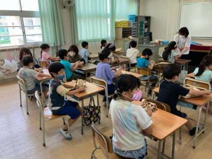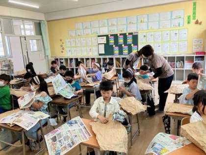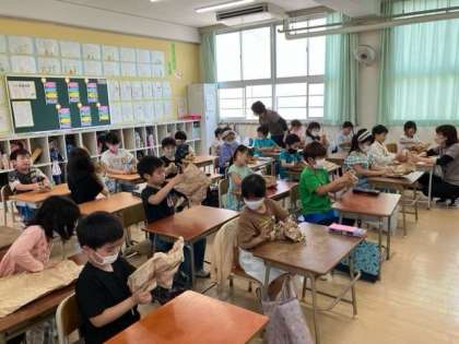 図工科の学習の「くしゃくしゃぎゅっ」という教材で、袋に新聞紙を詰め込んで生き物を作ります。今日の学習では、袋をくしゃくしゃにし、新聞紙をぎゅっと詰め込んでいます。さあ、どんな生き物ができるのでしょうか?お楽しみに!!