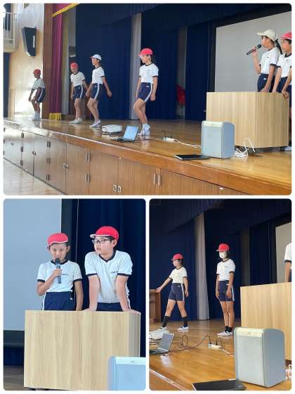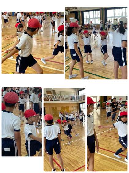 今日は6年生と1年生が合同で体育をしました。運動会でも披露する神津体操を1年生にレクチャーしました。1グループが2つの動きを担当し、丁寧に説明をしながら、6年生が1年生の横について教えました。1年生はとってもかわいく、一生懸命に体操をしてくれました。最後には楽しかった!と言ってくれて本当によかったです。これからも頼れる6年生を目指して、頑張っていきましょう!
