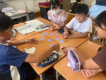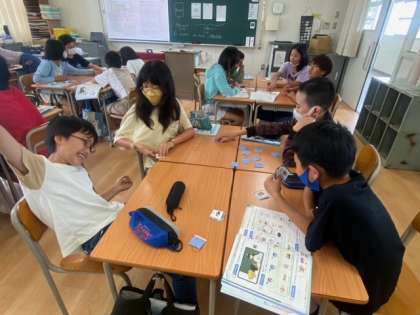 今日は、神経衰弱に似たゲームをしました。季節が書かれたカードを1枚、行事が書かれたカードを1枚ずつ引き、季節と行事が合っていればカードをもらえるというゲームです。カードを引いた時に「In spring,we have hanami.」などのように言うのがまだ難しそうでしたが、楽しんでゲームに取り組んでいました。