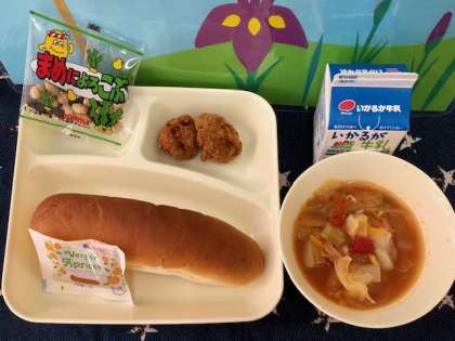 今日の給食では、鶏肉とキャベツ、たまねぎ、トマトなどの野菜が使われています。