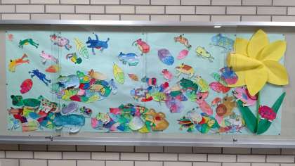 六月の玄関掲示を三年生の「〜みたいなかえる」が元気に跳んでいます!