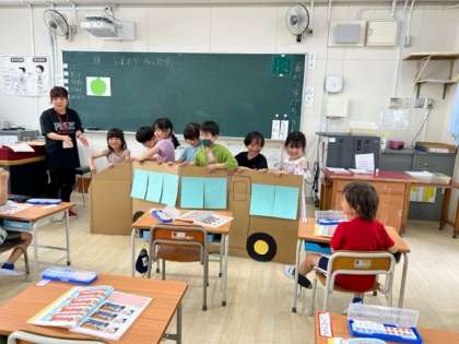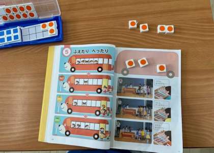 算数「ふえたり へったり」の学習では、教室に大きなバスがやってきて、こどもたちは大よろこび!!