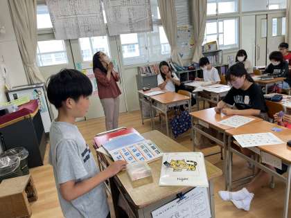 今日の学習では、引き続き見たいスポーツをたずねたり、答えたりする学習です。まずはじめに、ルー先生の見たいスポーツを予想するゲームをしました。なんと見事3個とも正解した人がいました!