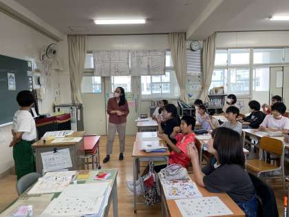 その後は、出題したい人が前に出て、その友だちの見たいスポーツをみんなで予想しました。今日はWhat do you want to watch?と