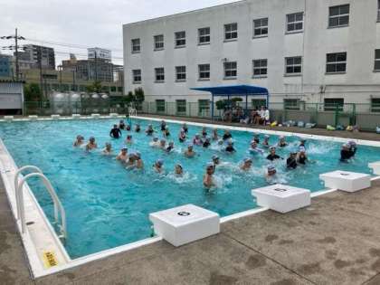 今日1時間目にプールに入りました。少し寒かったですが、みんな楽しそうに活動していました。