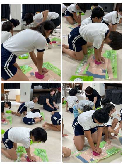 今日は2学期初めての発育測定がありました。今回の保健指導は、心肺蘇生法を学びました。まずは小学生が登校時に倒れた人と出会い、自分たちにできることを考える動画を見ました。