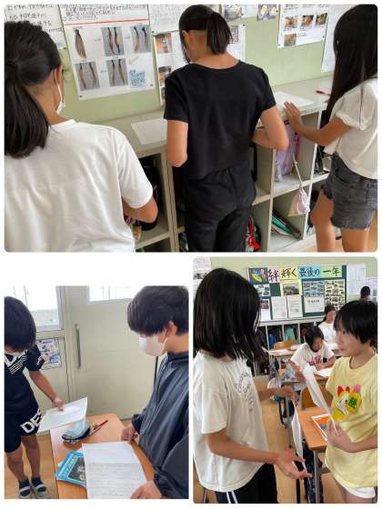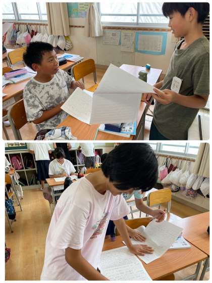 6年生は夏休みの宿題で、読書感想文か夏休みの思い出作文を書いてきています。担任が読み、コメントを書きましたが、みんなの作文があまりに良かったので、友だちと読み合いをすることにしました。