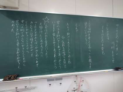 ひとかたまりの炎が金色に輝くライオンの形になって天に昇って行った場面に作者はどんな思いを込めたのかを考えました。