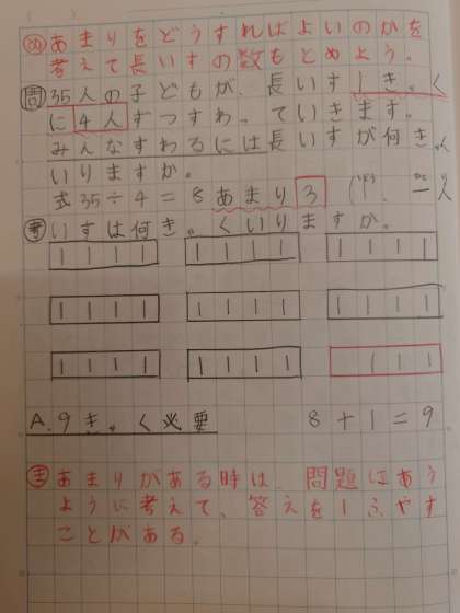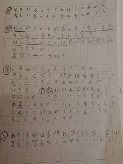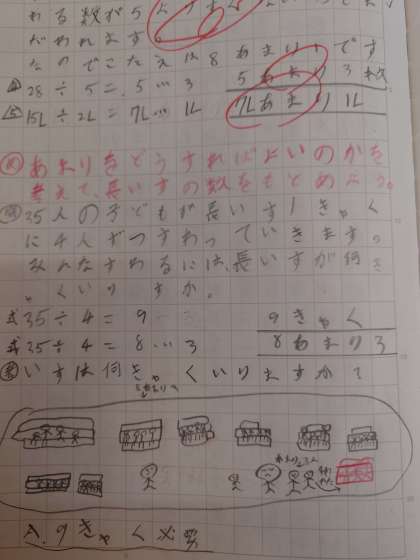 考えをまとめる活動では図や文章で、なぜ余りを切り上げるのかの説明を書き表すことができていました。
