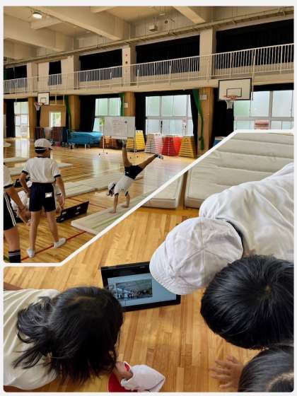 体育でマット運動をしました。タブレットで試技を確認しながらより良くなるように練習しています。