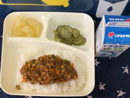 今日の大豆入りキーマカレーライス[米粉]には、新食品の「豚レバー(チップ)」を使っています。
