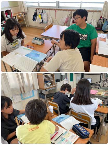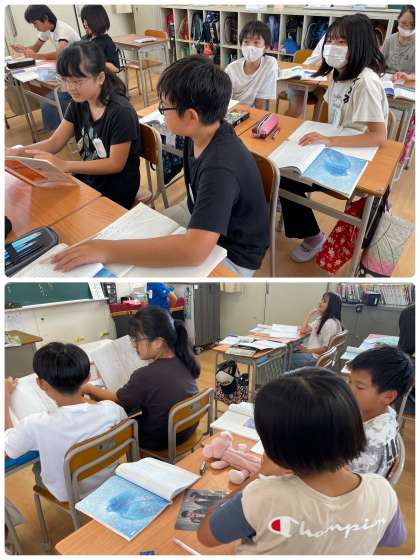 今日から海のいのちの学習がスタートしました!先生が読むのを聞いた後、印象に残ったところや心に残ったところ、不思議に思ったところなどをノートに書き、友だちと交流しました。