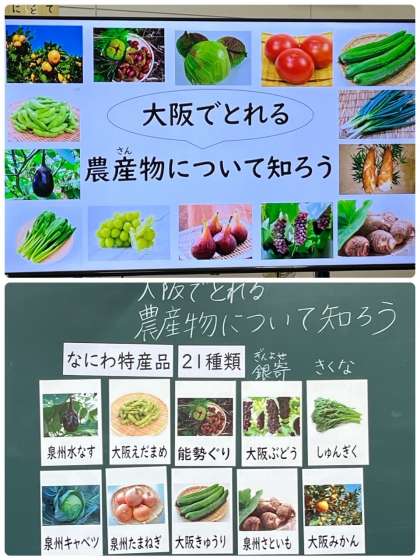 栄養指導があり、大阪でとれる農産物について教えていただきました。なにわ特産品の21種類のうち10種類を知り、これらの野菜を使うとどんな良いことがあるかを考えました。いろんな発見があり、楽しく学習することができました。