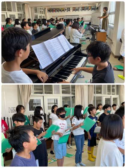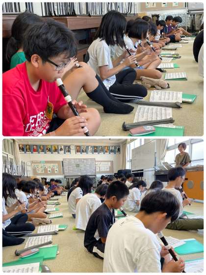 音楽の学習は1.2組合同で行いました!まず「カノン」の練習をしました。毎日の宿題で1学期の時より驚くほど上達しています!宿題でのリコーダーの演奏の練習にお付き合いいただきありがとうございます。