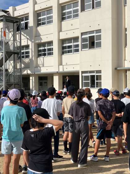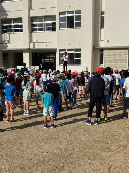 今日の全校朝会では、1ヶ月間みんなと一緒に勉強、運動をしてきた「重成先生」が、明日で最後ということであいさつをしてくれました。