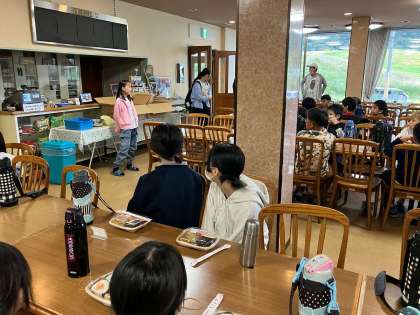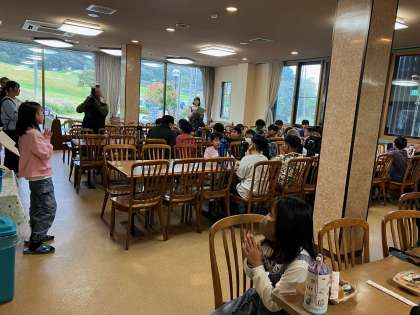 残念ながら雨が降っていますので、食堂での昼食タイムですが、みんなおいしくいただいています。