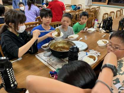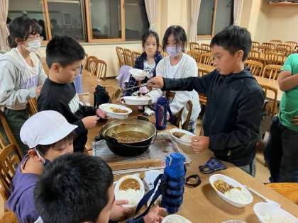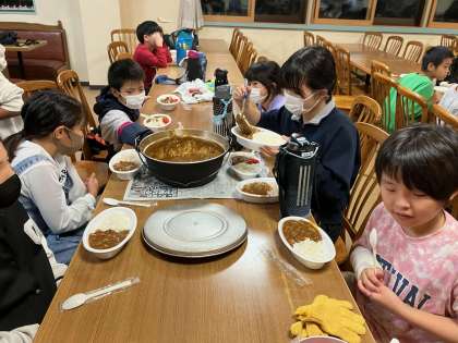 出来上がったカレーをついでいます。美味しいかな?早く食べたいです。