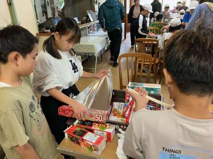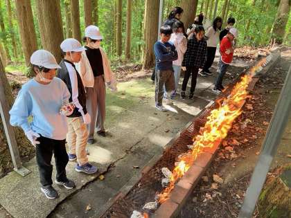 最後のプログラムのカートンドッグ作りです。キャベツとウィンナーをパンに挟み、アルミにまいて焼いています。できあがりが楽しみです。