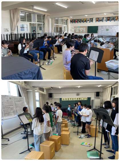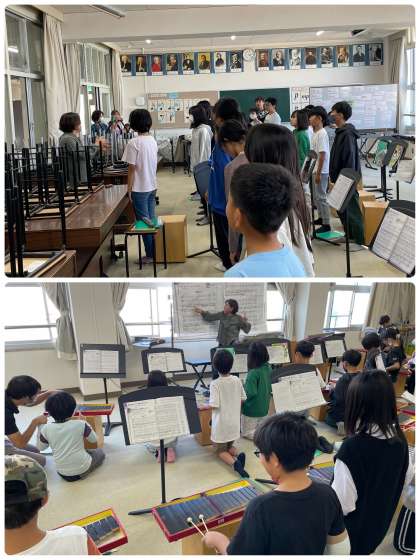 5時間目の音楽の時間には、カノンをリコーダーで演奏した後、ふるさとを合唱しました。3番を覚えるために練習中です。そして、風を切っての合奏をしました。今日は全員ミニ木琴を使いました!和音の数が多くなかなか難しかったようです。
