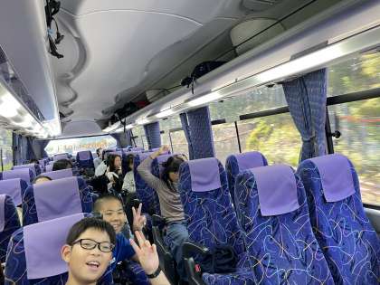 元気に52名出発しました!バスでは音楽が流れて楽しそうに過ごしています。まだまだ長旅ですが、元気にがんばります!