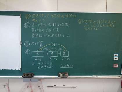 今日は「赤が4m、青が赤の二倍走った、黄色が青の三倍の距離を走った。黄色の走った距離は何mか」を求める問題でした。