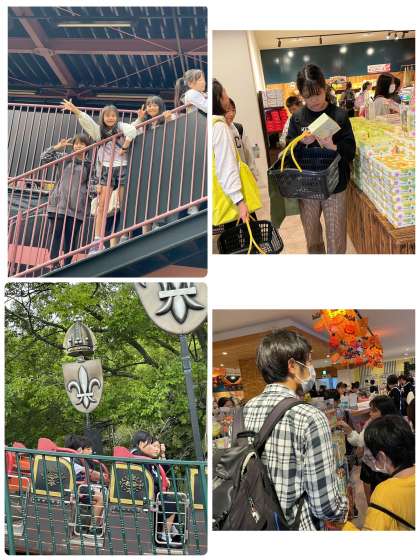 2日目はみろくの里に行きました!!!班ごとに遊園地を楽しく回ることができました。ジェットコースターやゴーカートなどおもしろいアトラクションがいっぱいありました!途中で雨が降ってきましたが、乗りたいものにはほとんど乗れたようです!
