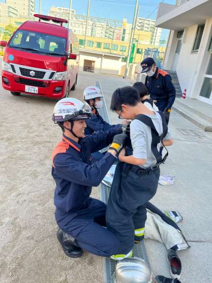 「重たい!」実際に1人ずつホースを持ち上げたり、防火衣を着せてもらったりして、装備の重たさに皆びっくりしました。
