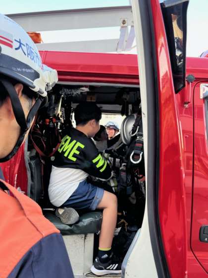 消防隊員の方々に、消防署の仕事は消火活動以外にも消火設備の点検、火事の原因調査などを行っていることや、ハシゴやホース、濃度計など、消防車の装備について教えてもらいました。