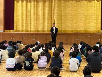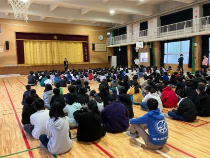 今日の全校朝会は天候の関係で講堂で行いました。